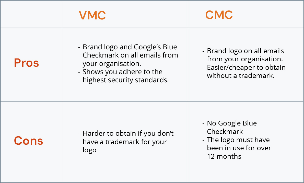 Whether to choose a CMC or a VMC is mostly a question of size, resources, and industry. If you’re a smaller organisation with limited budget, a CMC is a wiser first choice that provides nearly all of the same benefits as a VMC except for the blue verified checkmark next to the sender name. This blue checkmark acts as an additional layer of identity verification in Gmail by indicating that a sender has adopted BIMI with VMC - the ultimate combo.